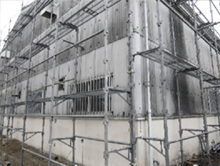 足場を組んで安全な現場を作り、飛散防止ネットで養生します。